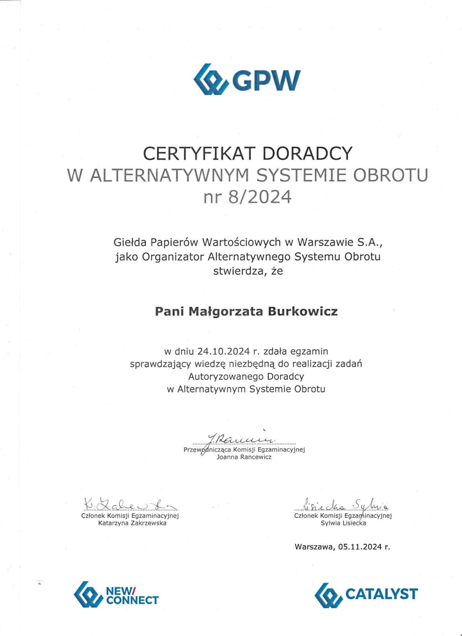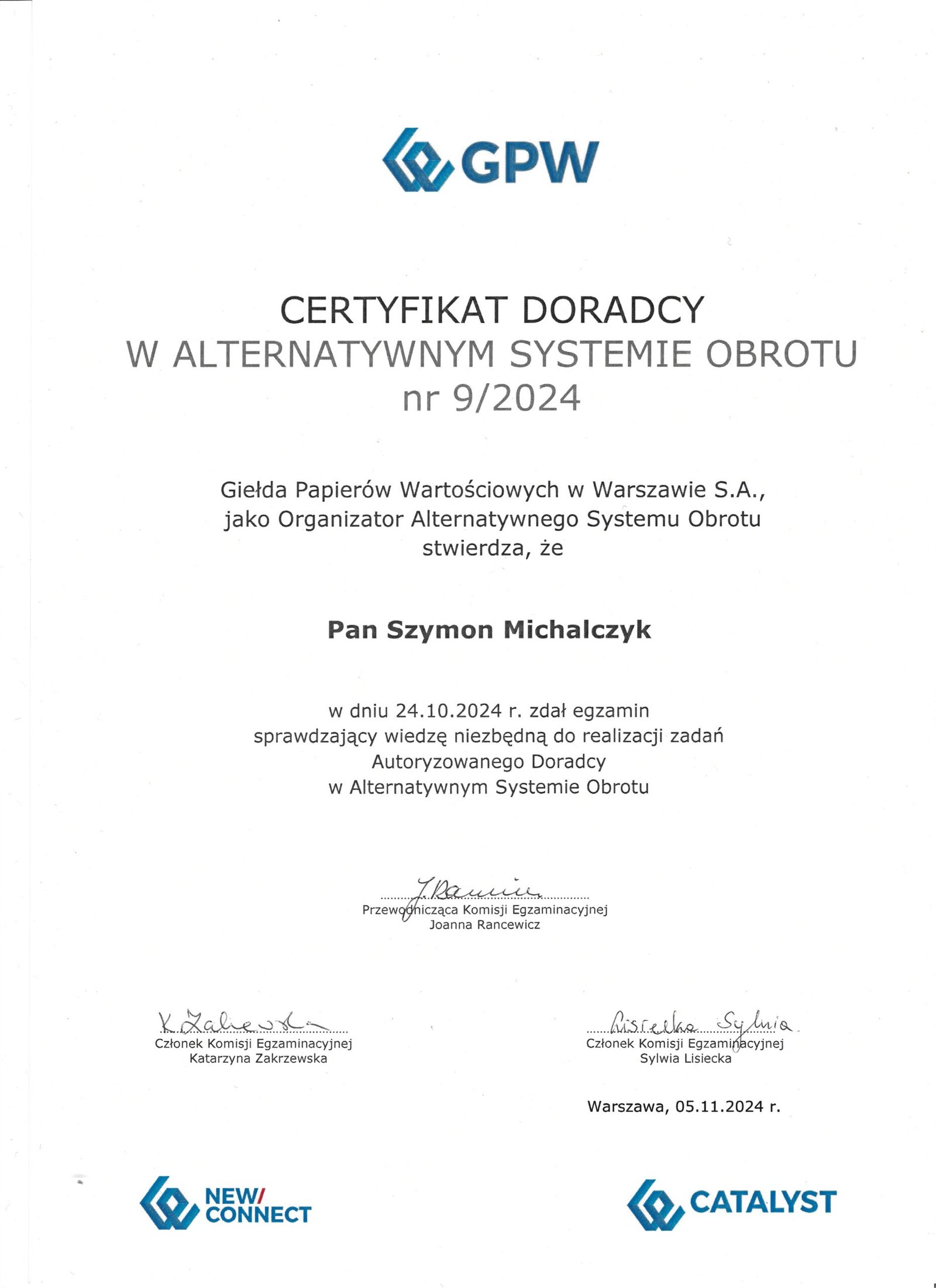 - Certyfikowany Doradca Alternatywnego Systemu Obrotu i Catalyst nr 9/2024