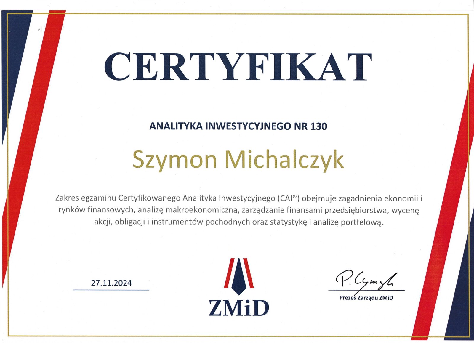 - Certyfikowany Analityk Inwestycyjny nr 130
